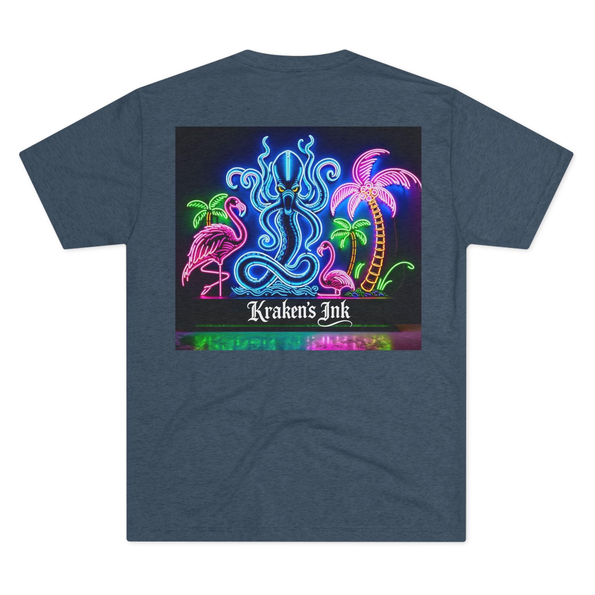 This lightweight tri-blend tee brings neon-soaked beach nights to your everyday rotation. A small, vintage-inspired badge on the chest pairs with a bold back print: a glowing kraken curled among palm trees and a flamingo, rendered like a retro neon sign. Soft, drapey fabric moves with you, while the structured seams and ribbed collar keep the shirt feeling put-together. Wear it for late-night boardwalks, tattoo sessions, or when you want that salty, electric island energy without trying too hard.