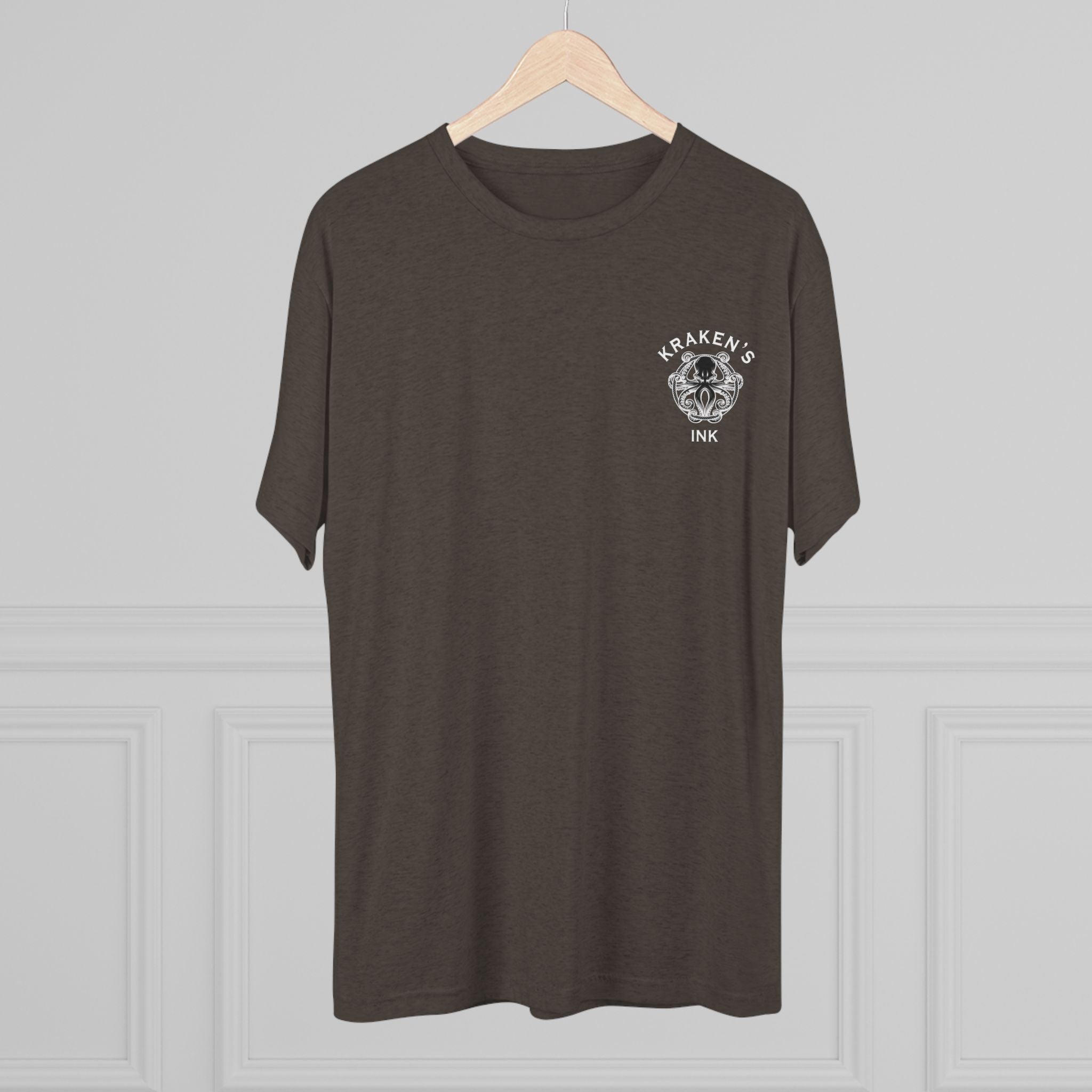 A lightweight, breathable tee that feels like an old favorite from the first wear. Soft tri-blend fabric drapes easily across the shoulders and keeps its shape thanks to side seams and shoulder tape. The front carries a subtle, nautical emblem while the back bursts into a vivid scene: a sunset-lit ocean, a graceful turtle, a diving seabird and the curling tentacles of a kraken rising from the waves above the scripted “Kraken’s Ink.” Wear it on warm evenings by the shore or under a jacket in town — it reads like a sailor’s storybook and becomes part of the daily rotation for anyone who loves ocean lore and bold, illustrated art.