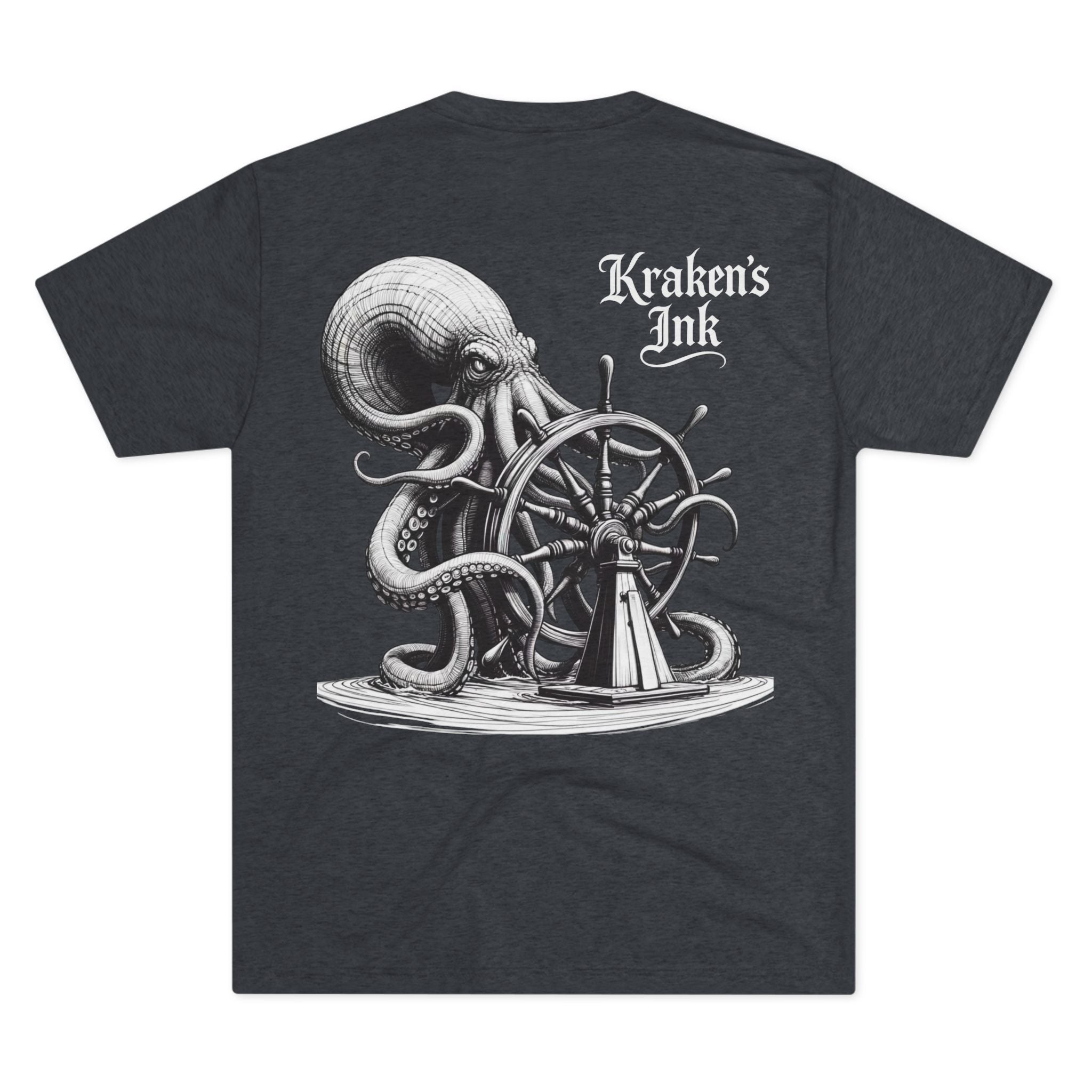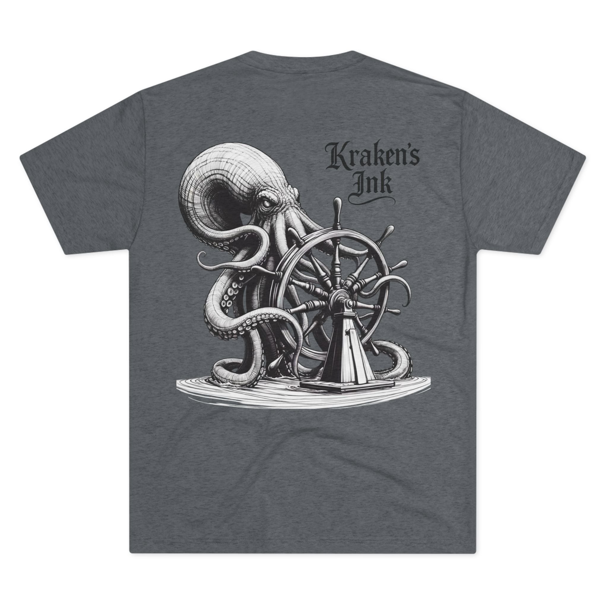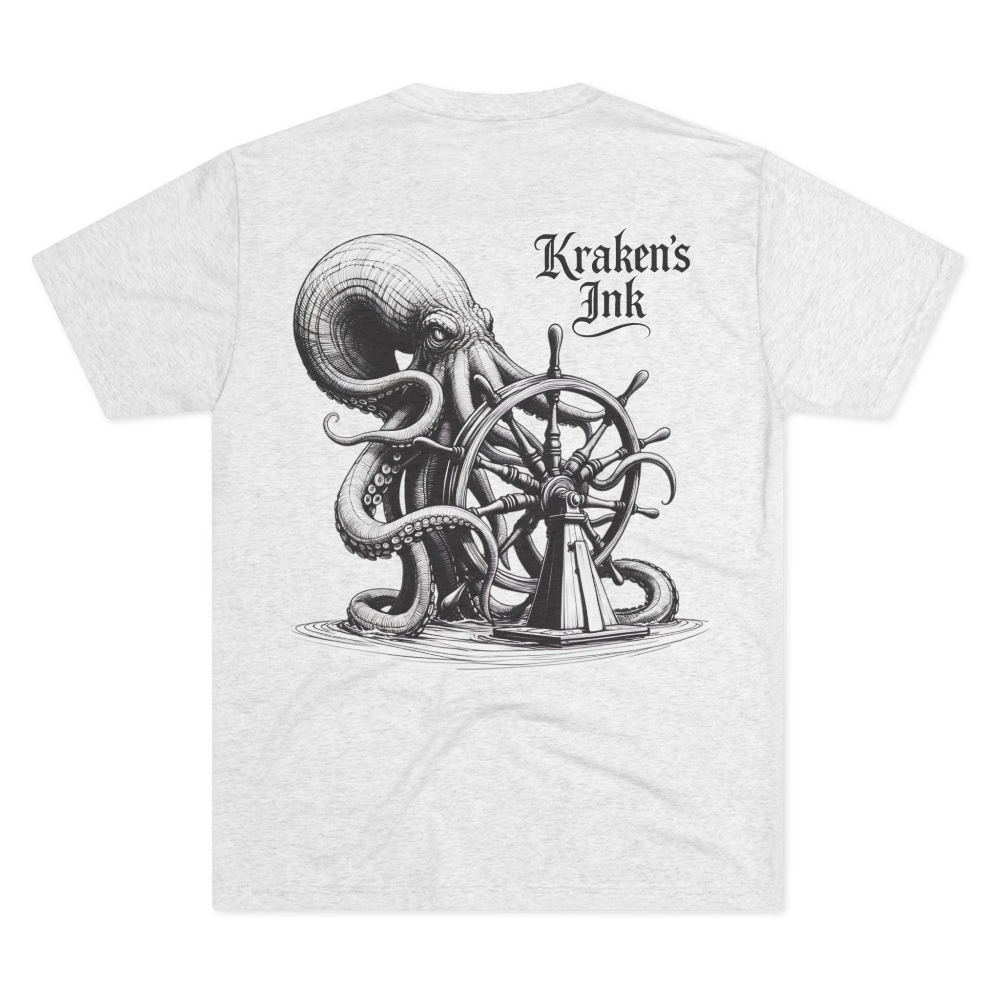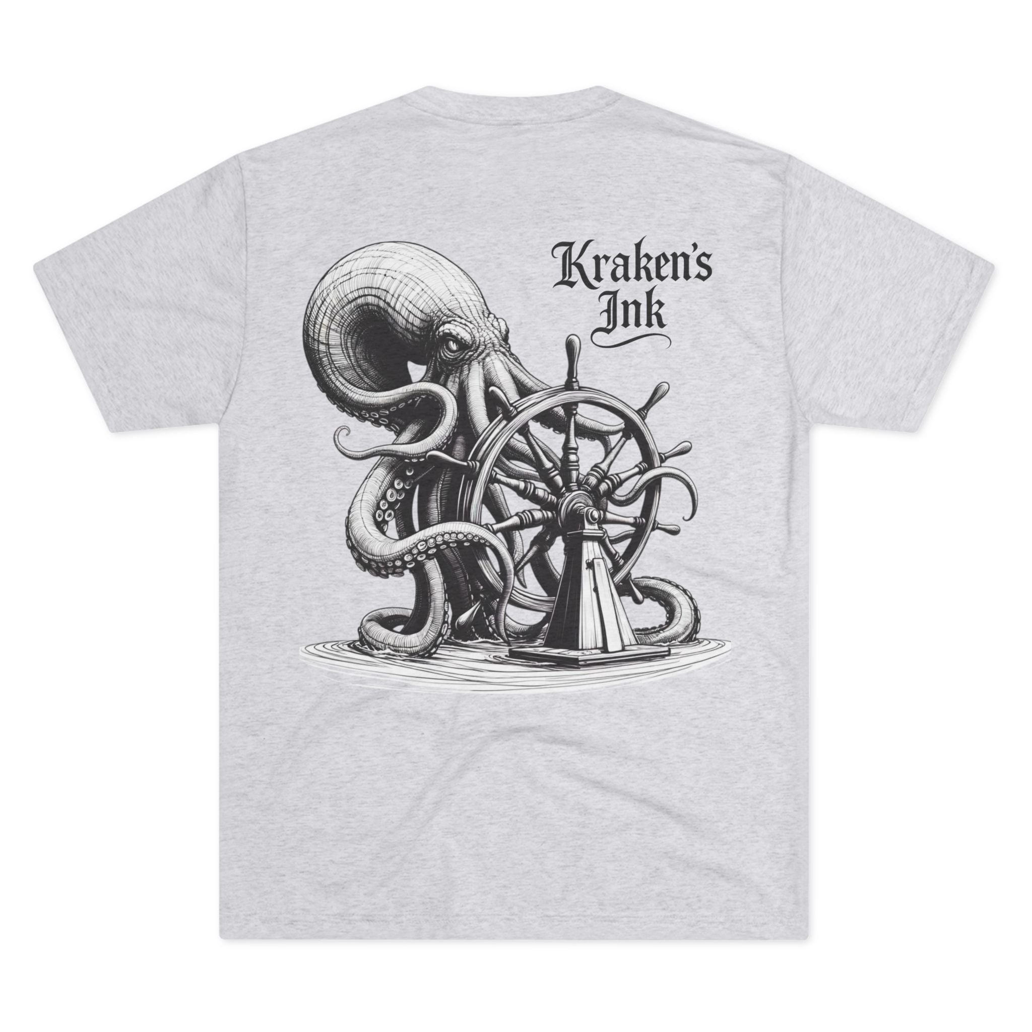 This lightweight crew tee carries a vintage maritime mood — quiet, worn, and ready for long days on deck or wandering the pier. An intricately shaded kraken curls around an old ship’s wheel on the back, while a small chest emblem sits over the heart. The soft tri-blend drape moves with you and keeps the art clear and detailed. Wear it with faded denim or layered under a weathered jacket; it reads like a sailor’s journal entry — thoughtful, a little salty, and full of stories.
