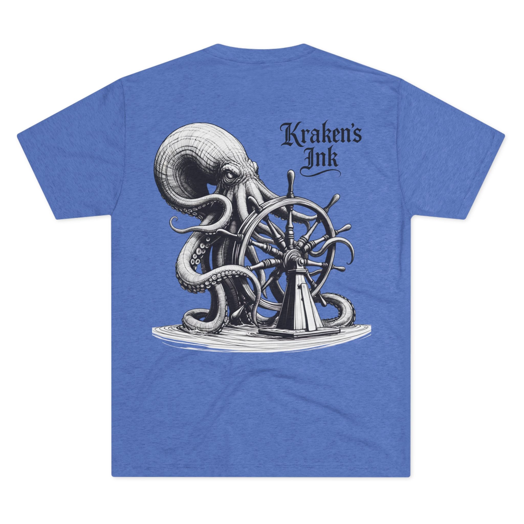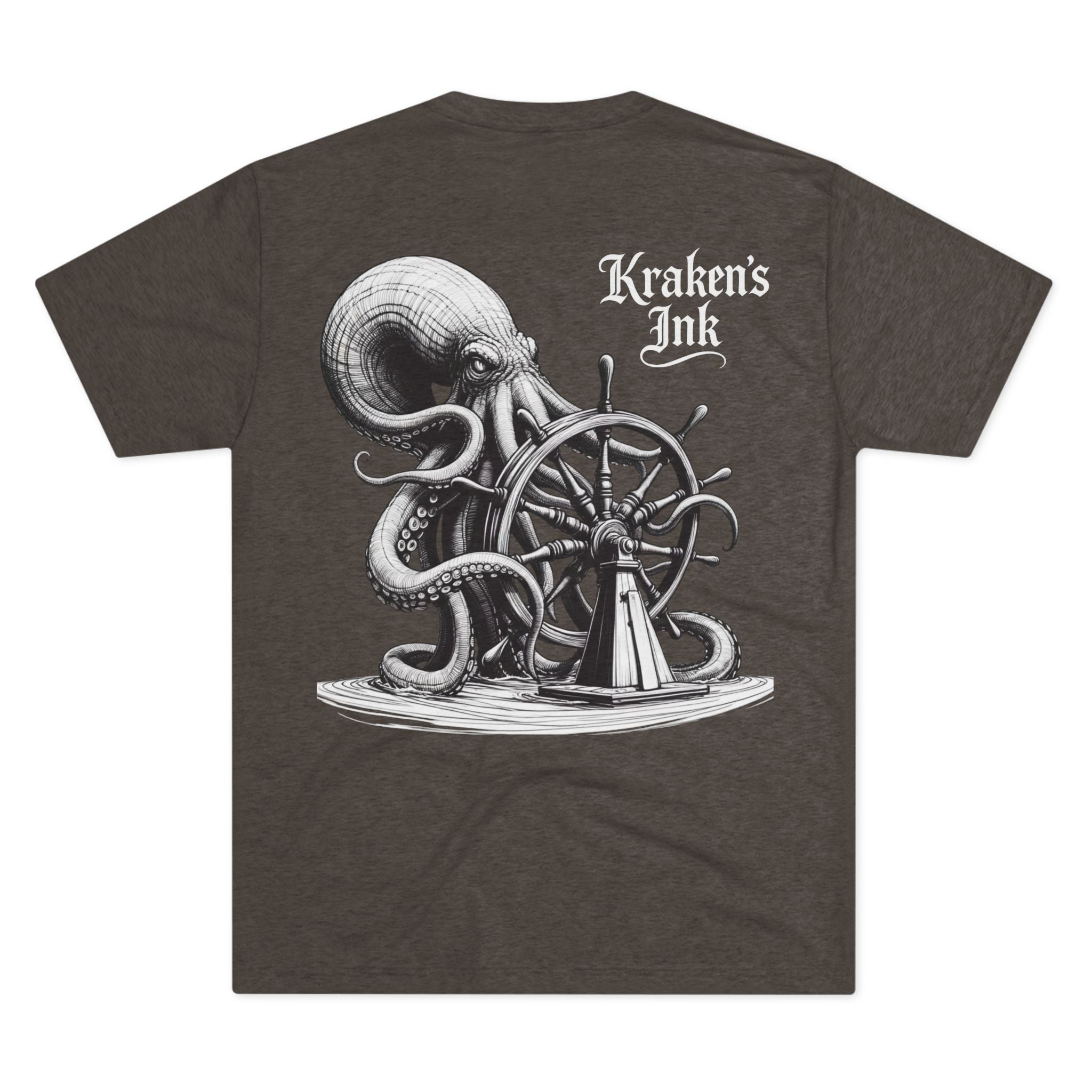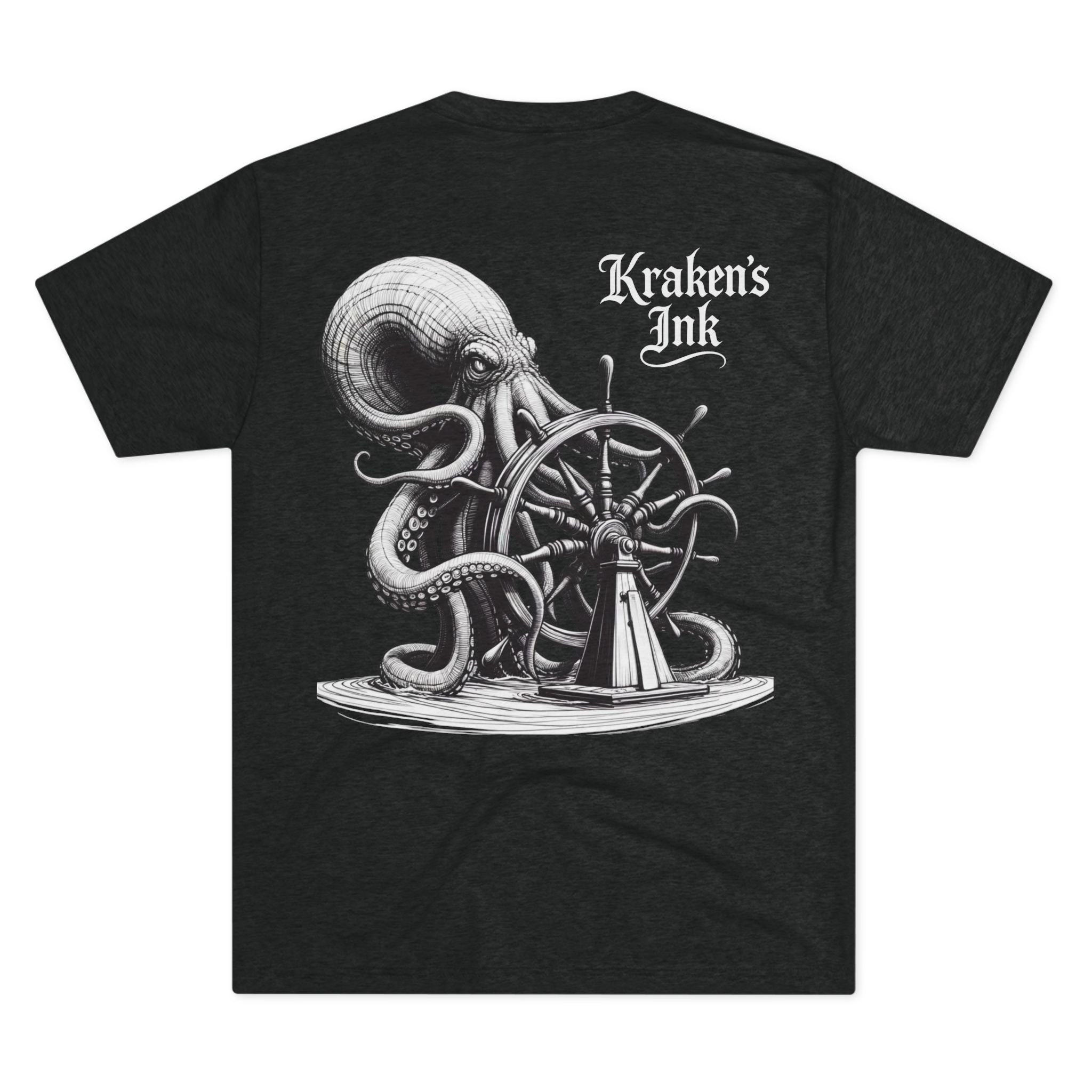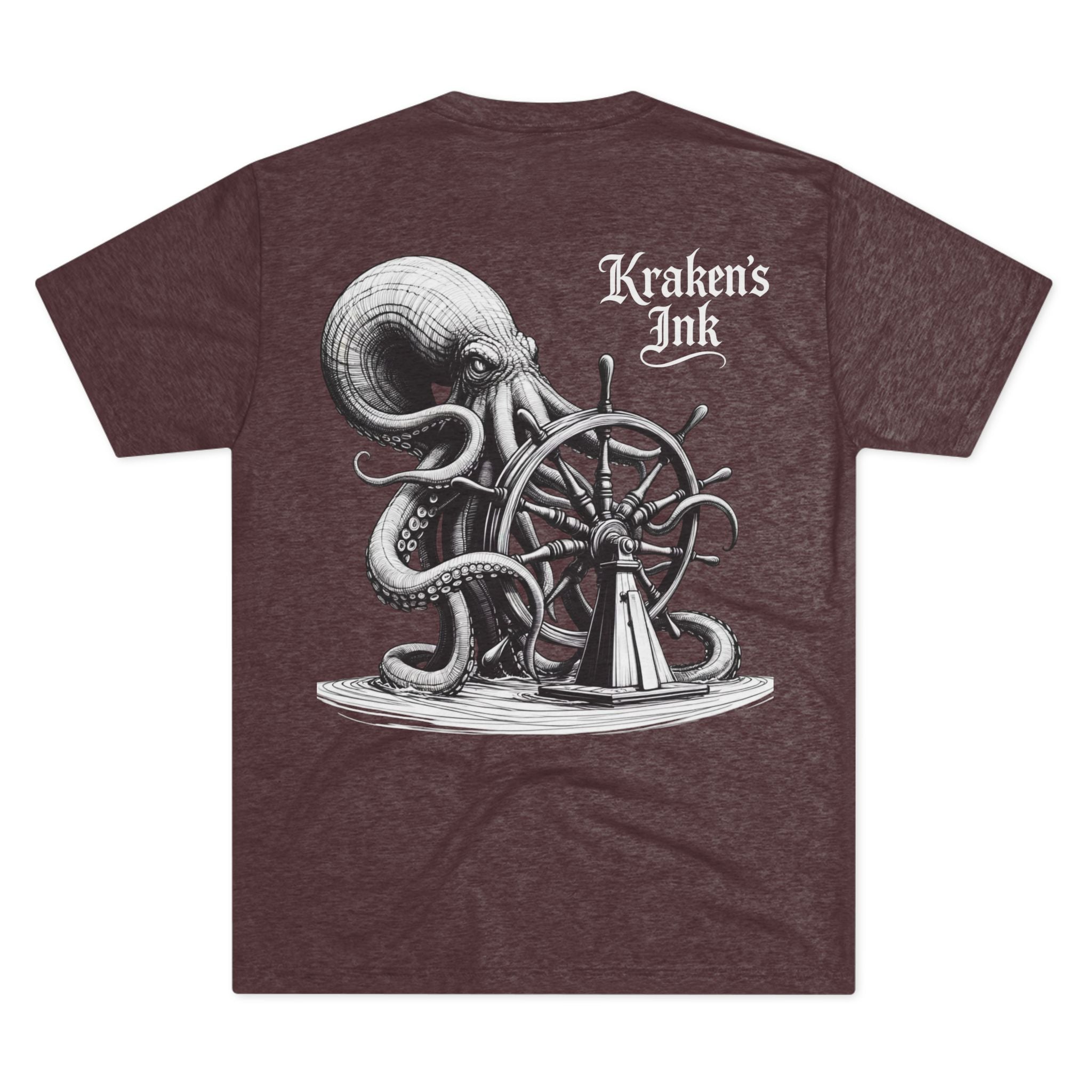 This lightweight crew tee carries a vintage maritime mood — quiet, worn, and ready for long days on deck or wandering the pier. An intricately shaded kraken curls around an old ship’s wheel on the back, while a small chest emblem sits over the heart. The soft tri-blend drape moves with you and keeps the art clear and detailed. Wear it with faded denim or layered under a weathered jacket; it reads like a sailor’s journal entry — thoughtful, a little salty, and full of stories.
