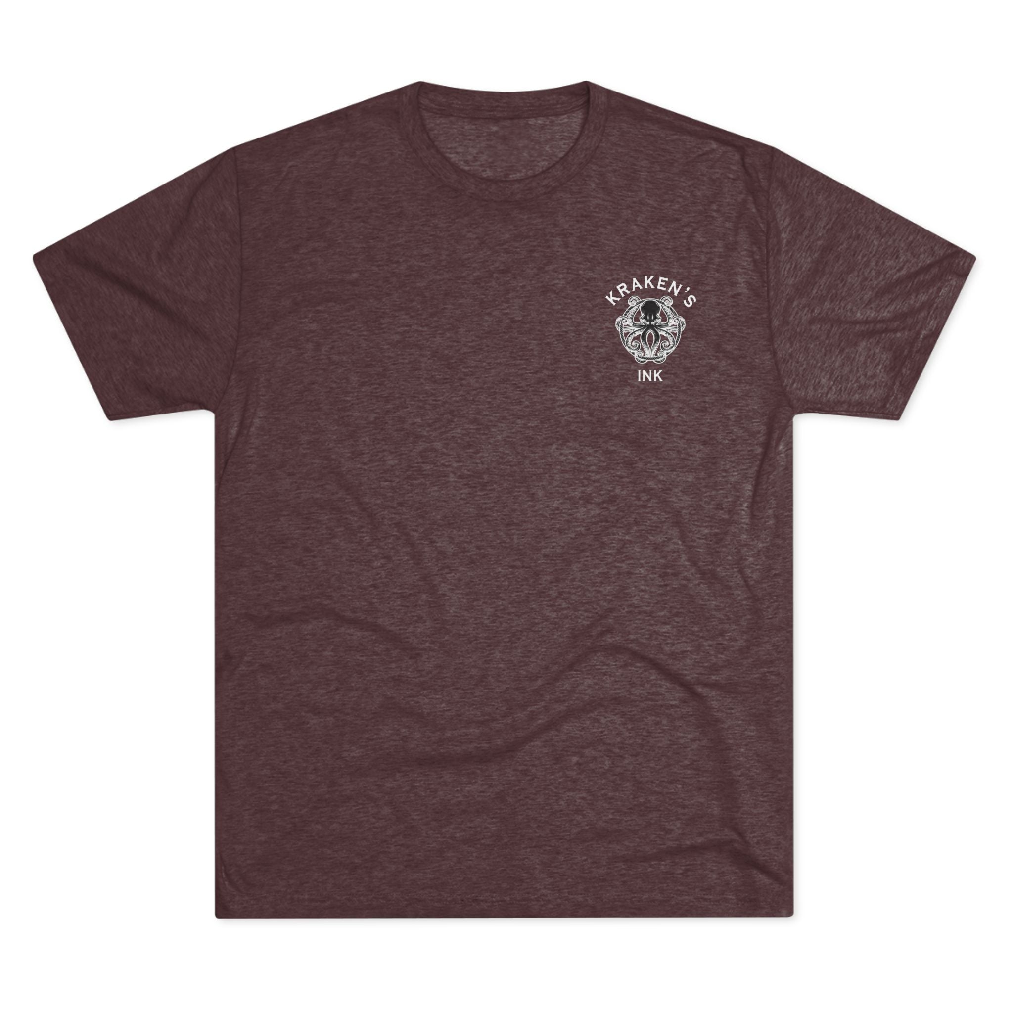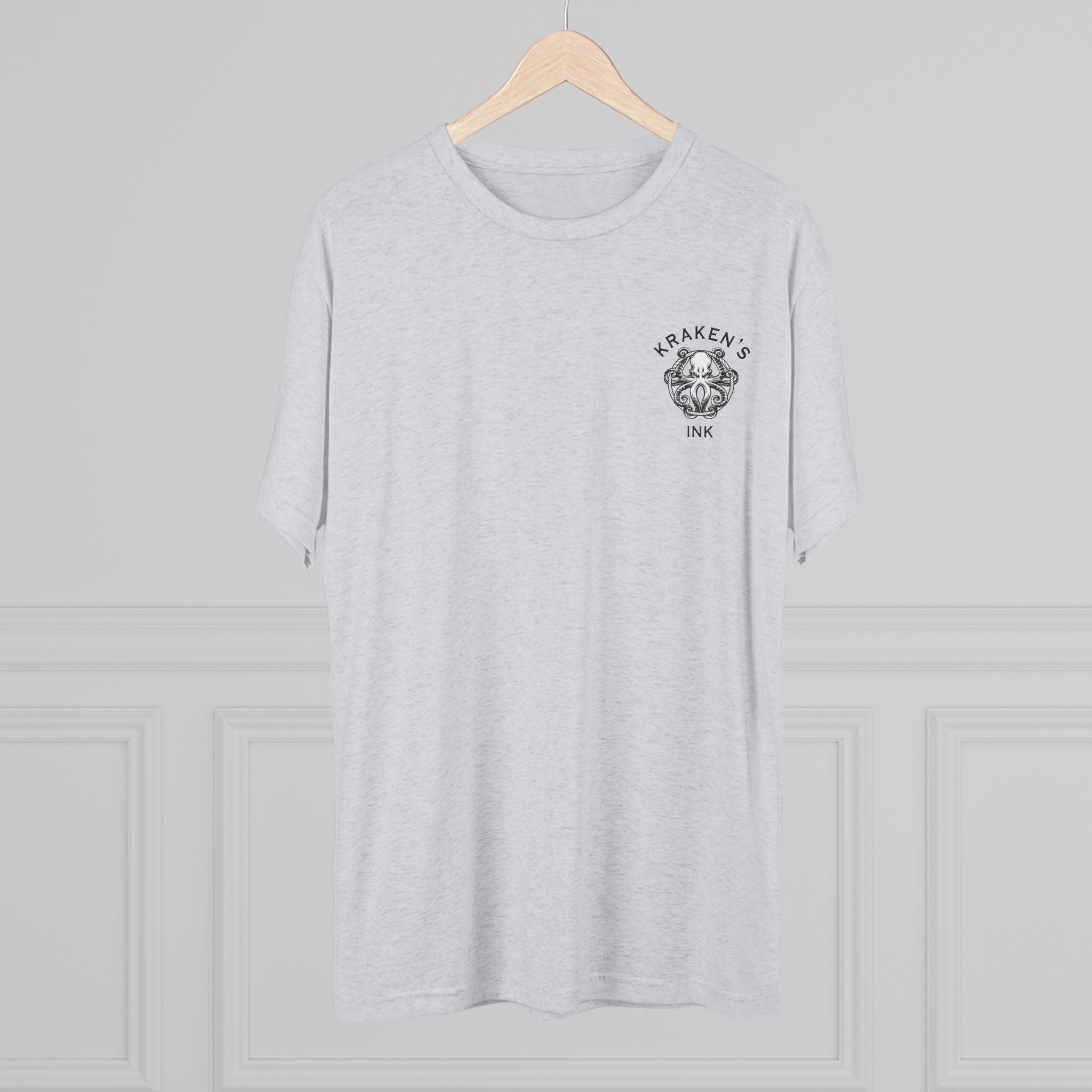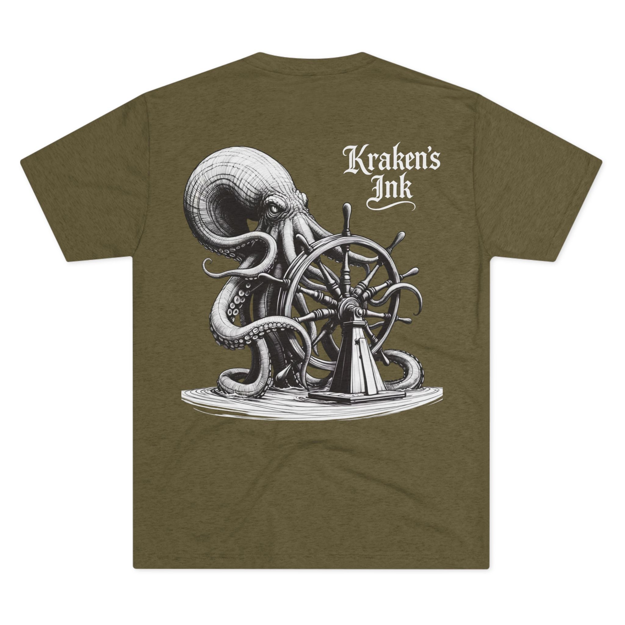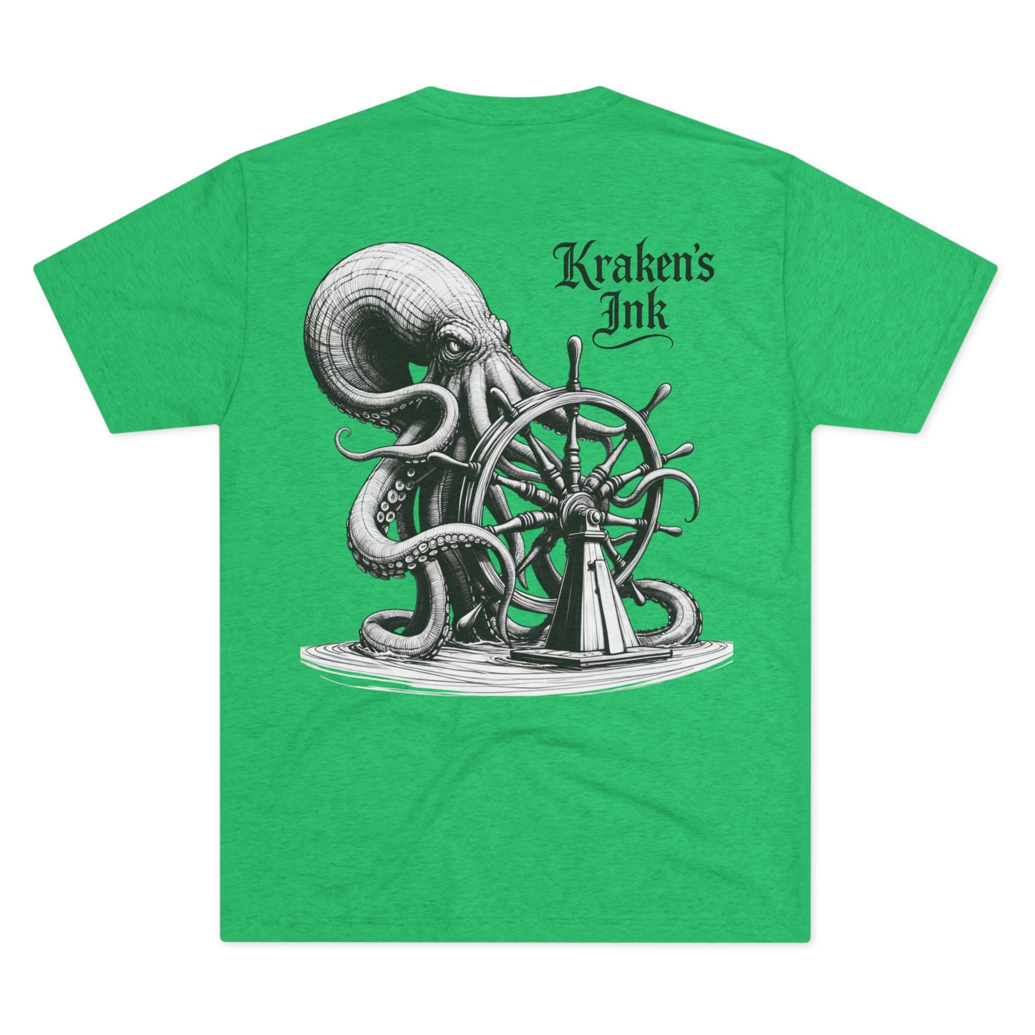 This lightweight crew tee carries a vintage maritime mood — quiet, worn, and ready for long days on deck or wandering the pier. An intricately shaded kraken curls around an old ship’s wheel on the back, while a small chest emblem sits over the heart. The soft tri-blend drape moves with you and keeps the art clear and detailed. Wear it with faded denim or layered under a weathered jacket; it reads like a sailor’s journal entry — thoughtful, a little salty, and full of stories.