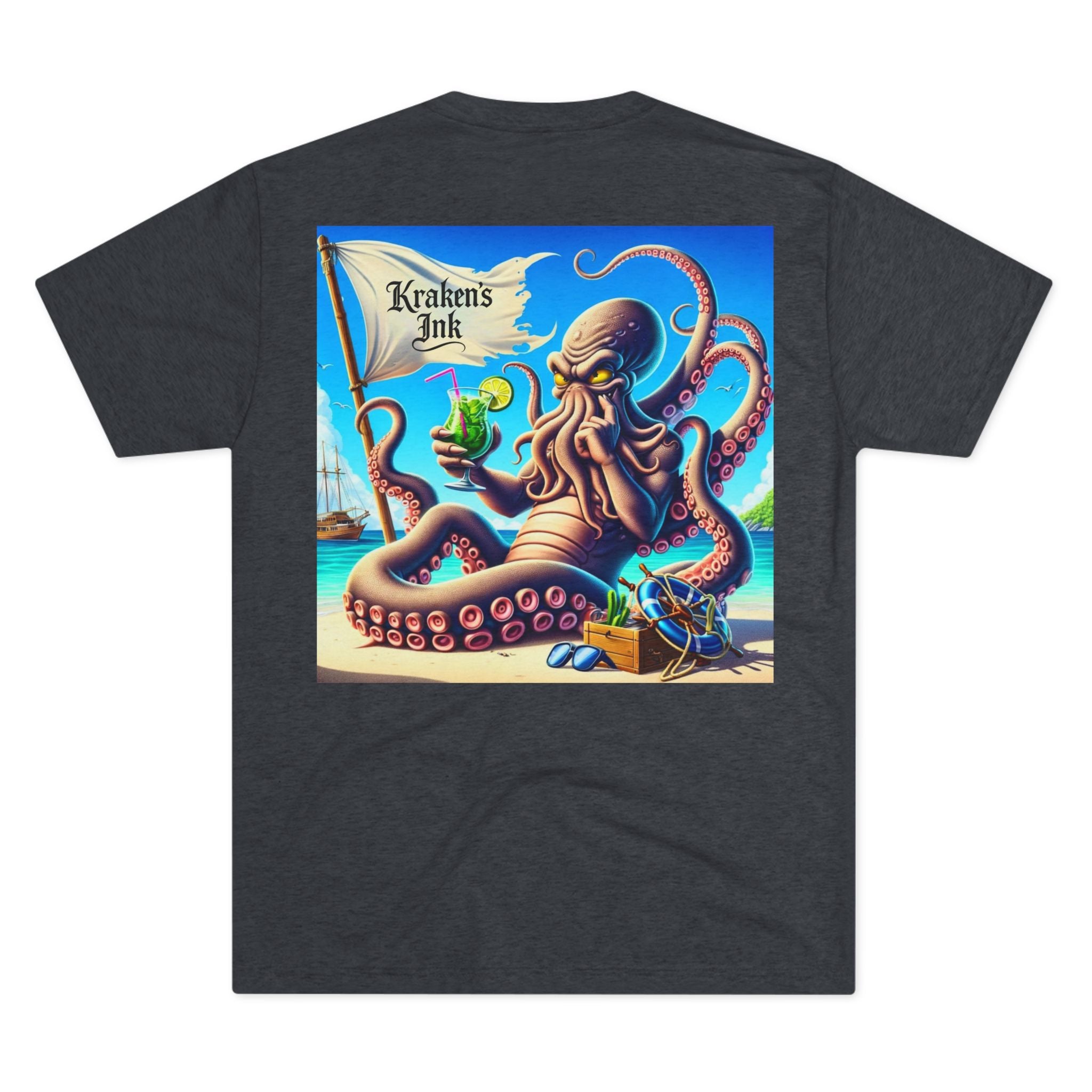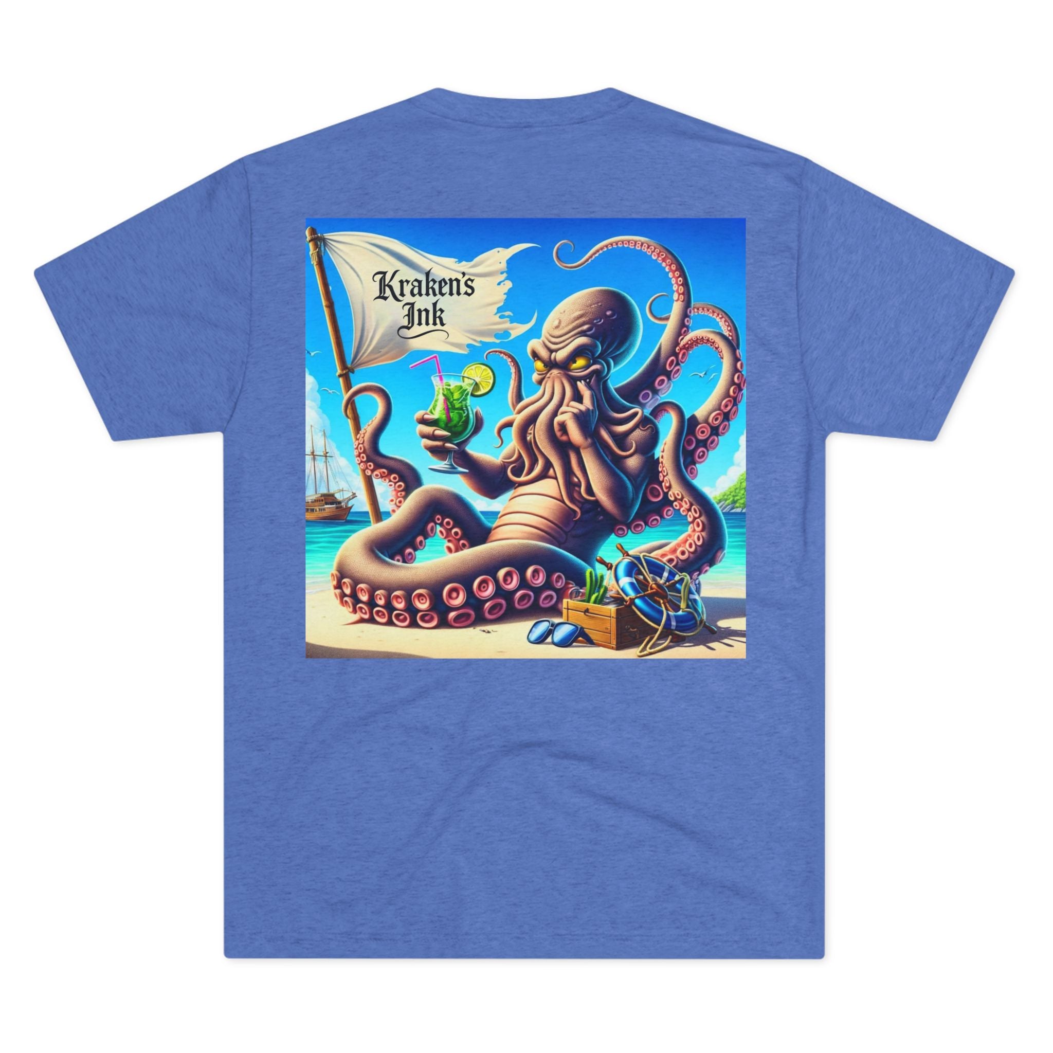 A lightweight, art-forward crew tee that brings seaside mischief to everyday wear. Soft tri-blend fabric drapes gently and breathes easily, letting a bold, colorful kraken illustration steal the show on the back while a small matching badge sits over the heart. Wear it for warm-weather outings, boat days, or whenever you want a splash of nautical personality — the shirt moves with you, resists stretching, and keeps its shape through repeated wears. The playful octopus scene and vintage flag detail read like a sunlit seaside poster, inviting stories of sandy beaches, treasure chests, and salt-tinged breeze.