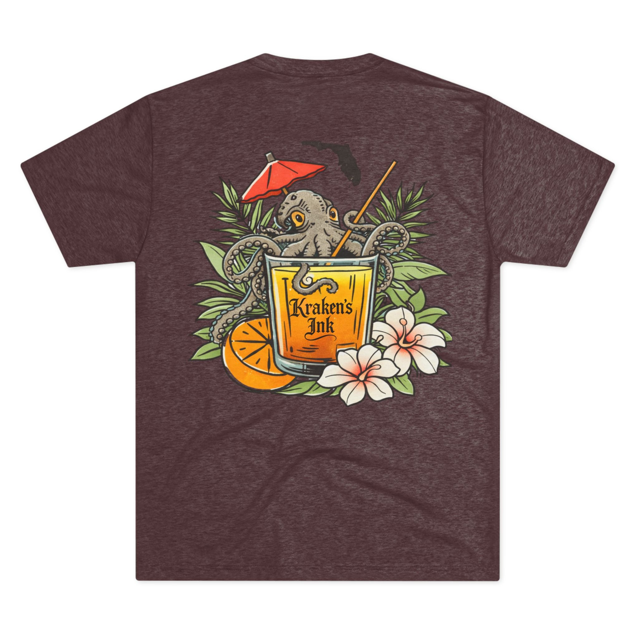 A lightweight, breathable crew tee that feels like an old favorite from the first wear. Soft tri-blend fabric drapes effortlessly across the body, letting the playful, island-inspired artwork on the back take center stage while a small emblem rests over the heart. Picture slow afternoons at a beachside bar: salt air, palm fronds rustling, and a frosty drink with a cheeky kraken curled around the glass. This tee brings that easygoing, sunlit vibe to weekend strolls, surf trips, and backyard hangs. Wear it with worn denim or boardshorts — it settles in comfortably and keeps its shape through repeated wears and washes thanks to reinforced seams and a ribbed collar. The subtle front logo keeps things understated, while the vibrant back illustration sparks conversations.
