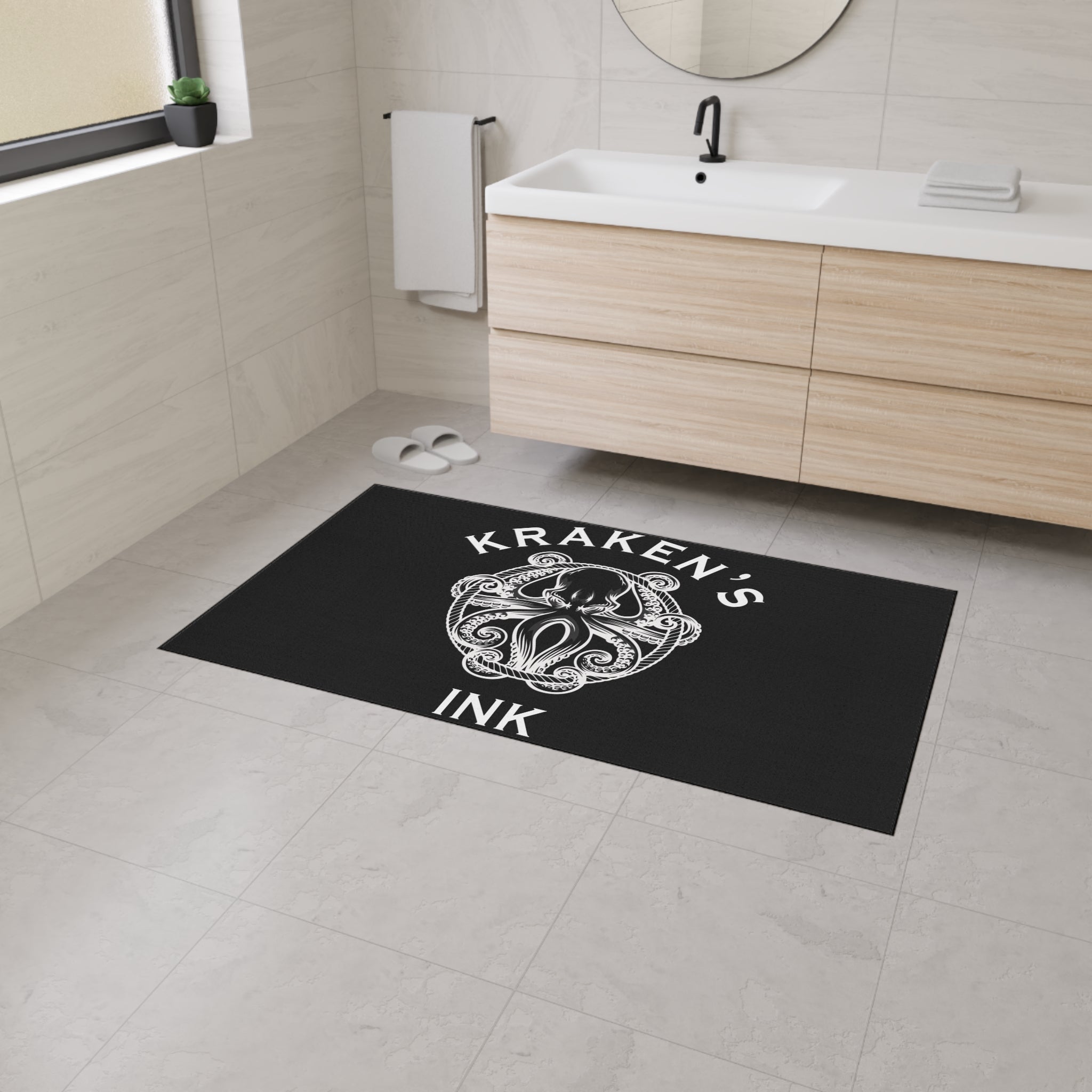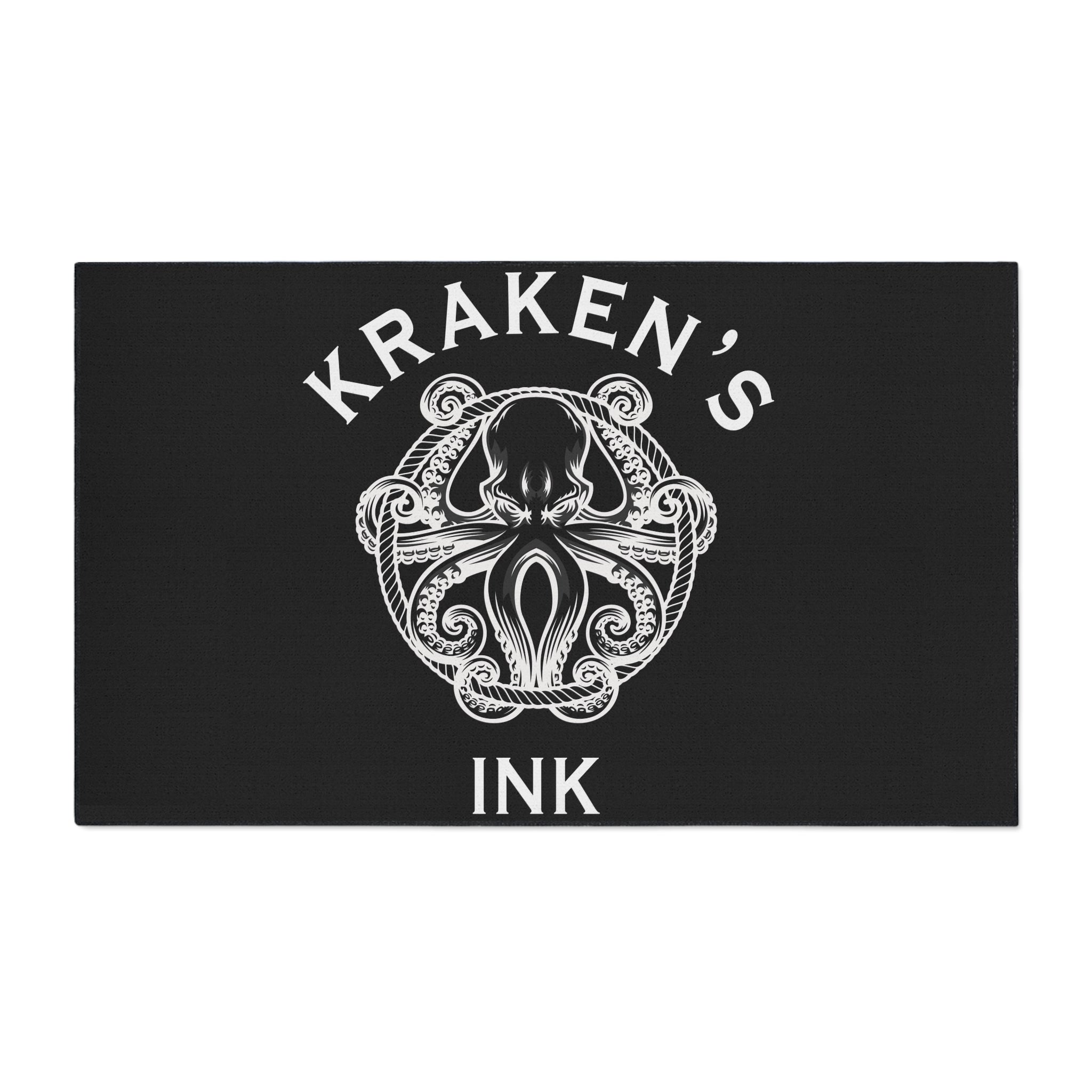 A rugged, graphic floor mat that brings maritime tattoo-shop attitude to your workspace or entryway. The black polyester surface features a crisp white Kraken illustration and bold lettering, giving the mat a high-contrast, hand-inked look that stands up to heavy foot traffic. The textured polyester face resists wear while the non-slip rubber backing keeps the mat planted during busy days. Trimmed in black and printed on one side, this mat feels right at home in art studios, ink shops, garages, or any space that leans into dark, bold decor. Assembled in the USA from globally sourced parts, it’s built to last and to keep your floors looking sharp.