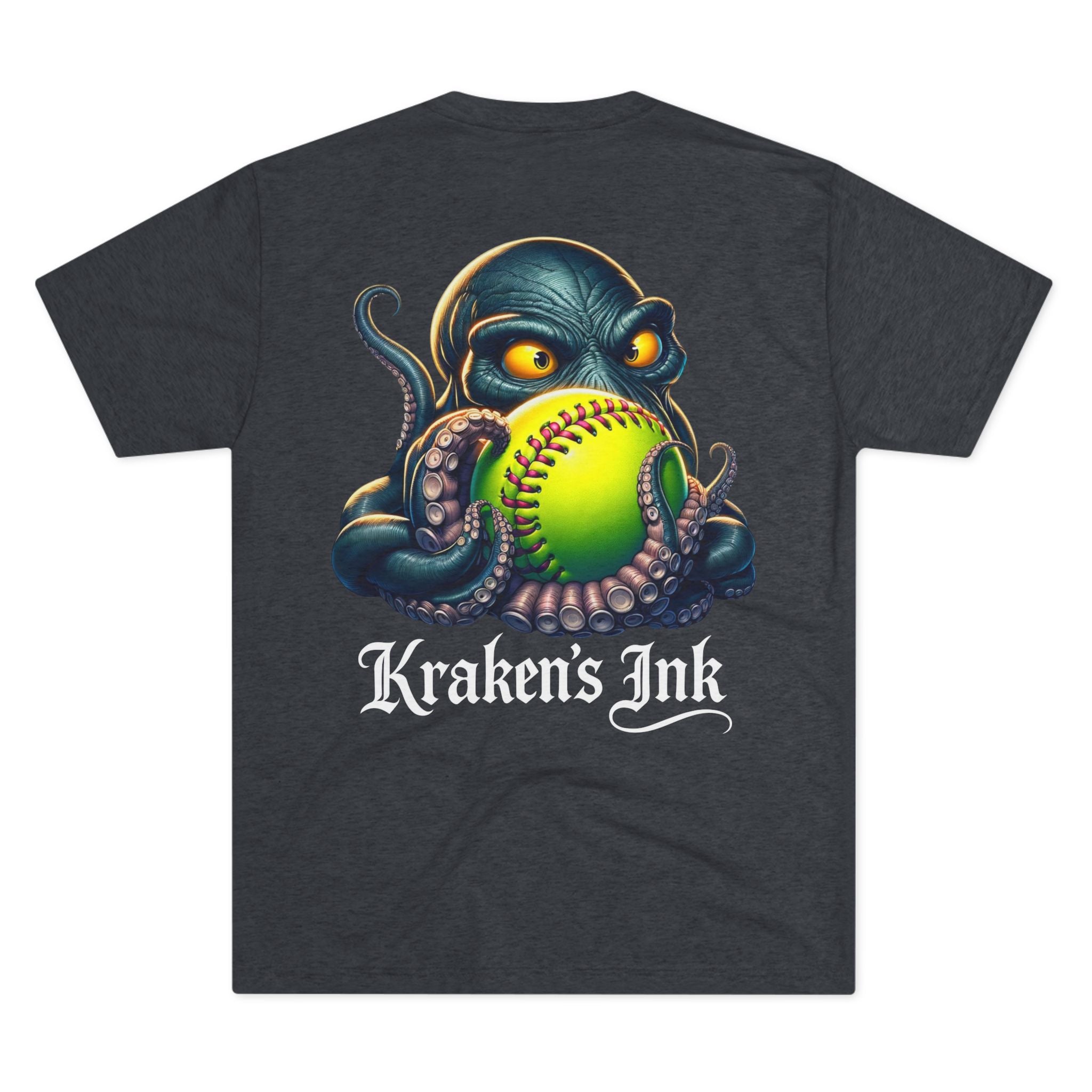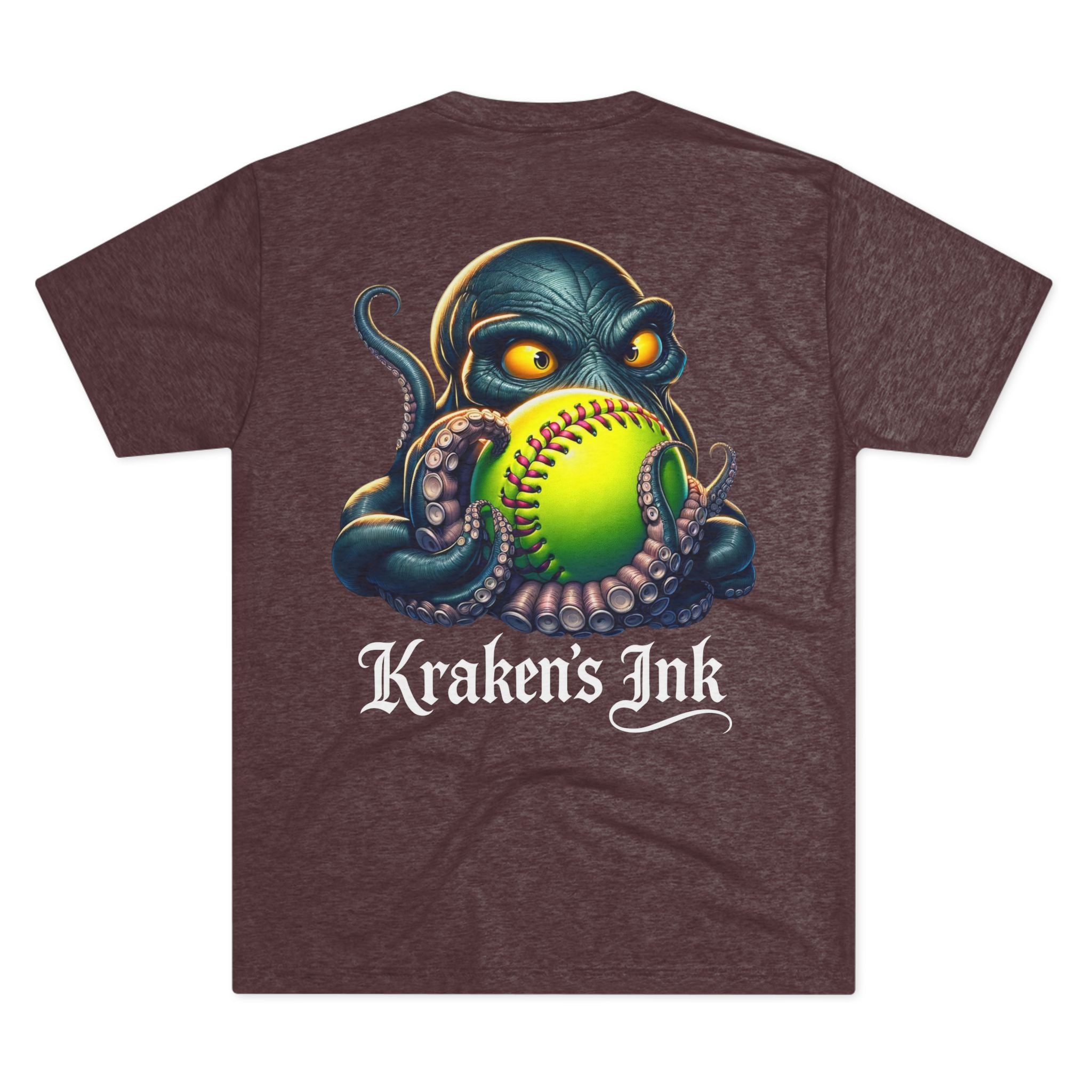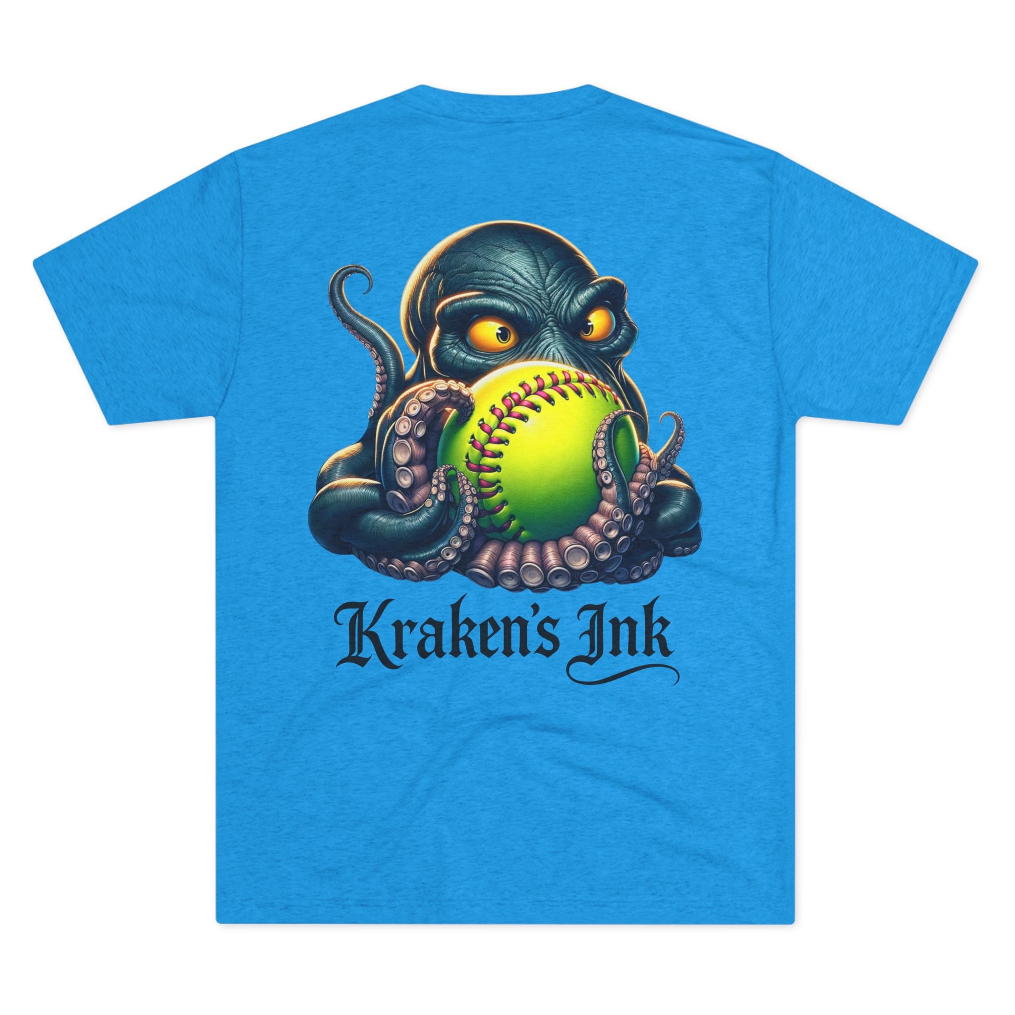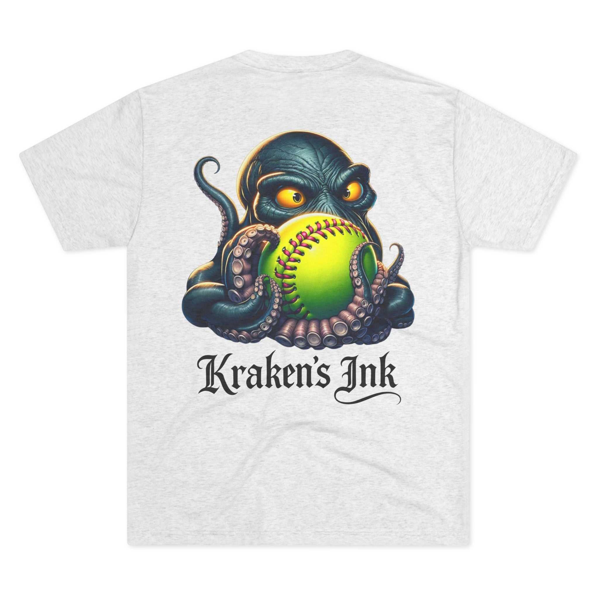 Light, breathable, and effortlessly cool — this tri-blend tee brings a touch of sea‑creature swagger to everyday wear. The front chest carries a compact Kraken’s Ink emblem, while the back reveals a bold, ink‑dark kraken clutching a neon softball, rendered with tattoo‑style shading and punchy colors. It sits comfortable and loose for long days at the field, the studio, or cruising town. Wear it to show a playful, gritty love for ink, sport, and seaside myth — like a clubhouse shirt that’s been washed, worn, and fiercely lived in.