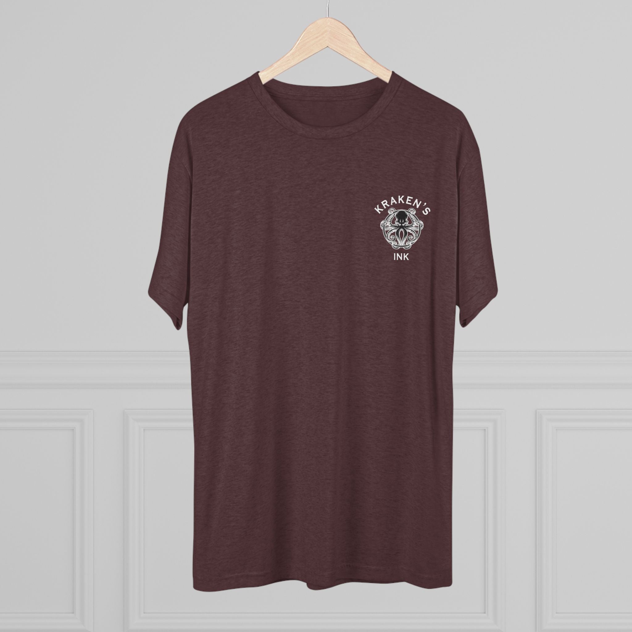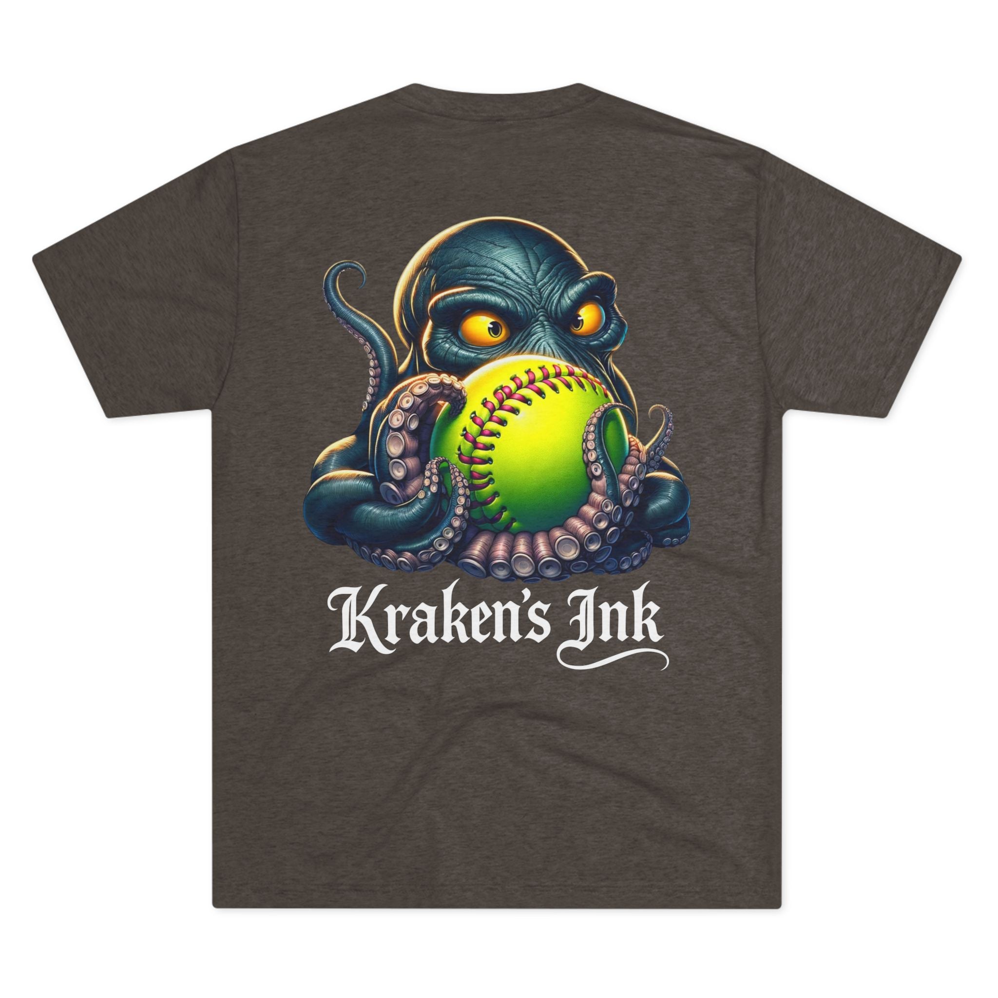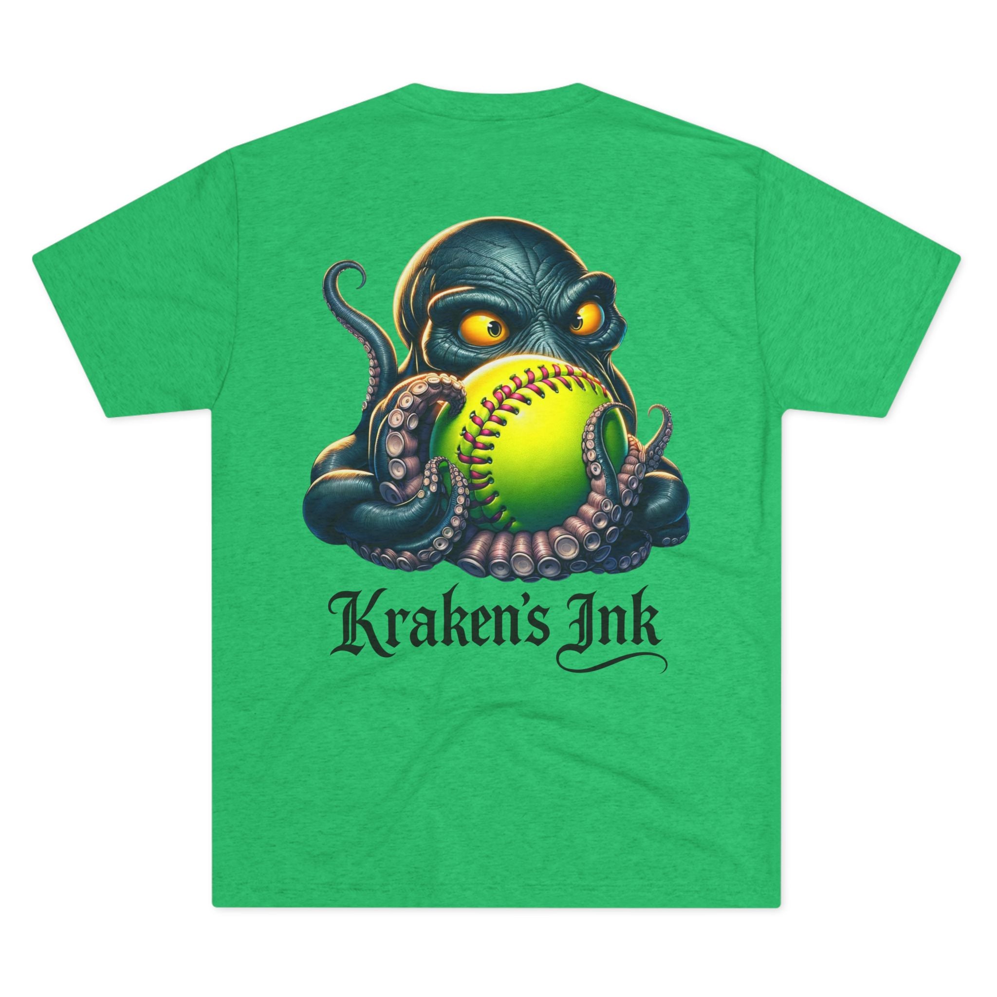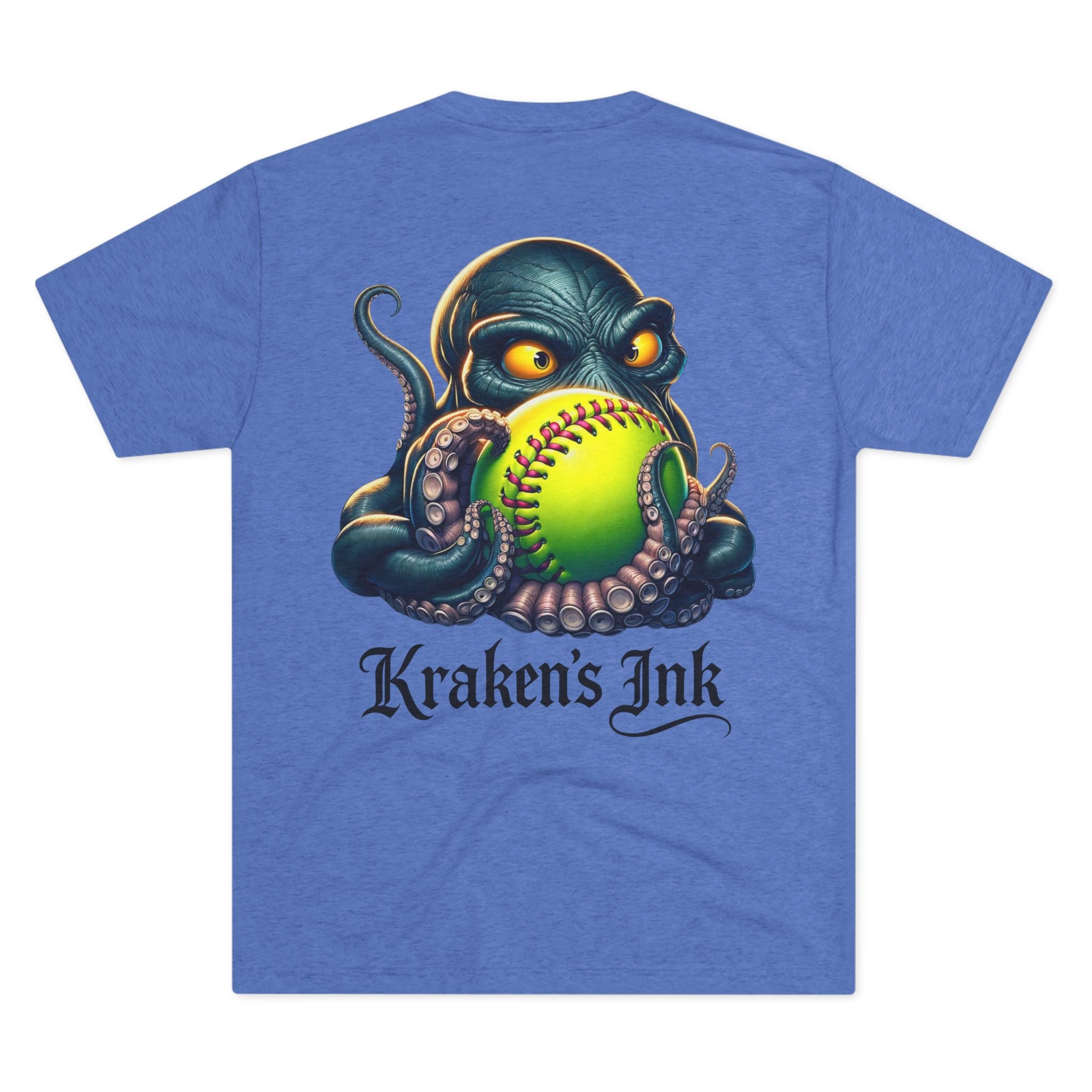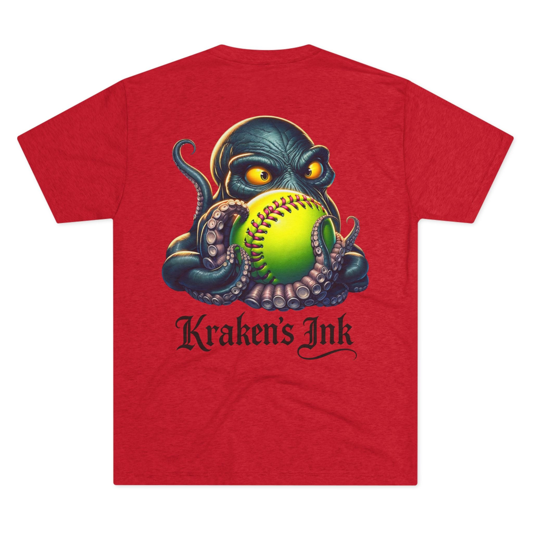 Light, breathable, and effortlessly cool — this tri-blend tee brings a touch of sea‑creature swagger to everyday wear. The front chest carries a compact Kraken’s Ink emblem, while the back reveals a bold, ink‑dark kraken clutching a neon softball, rendered with tattoo‑style shading and punchy colors. It sits comfortable and loose for long days at the field, the studio, or cruising town. Wear it to show a playful, gritty love for ink, sport, and seaside myth — like a clubhouse shirt that’s been washed, worn, and fiercely lived in.