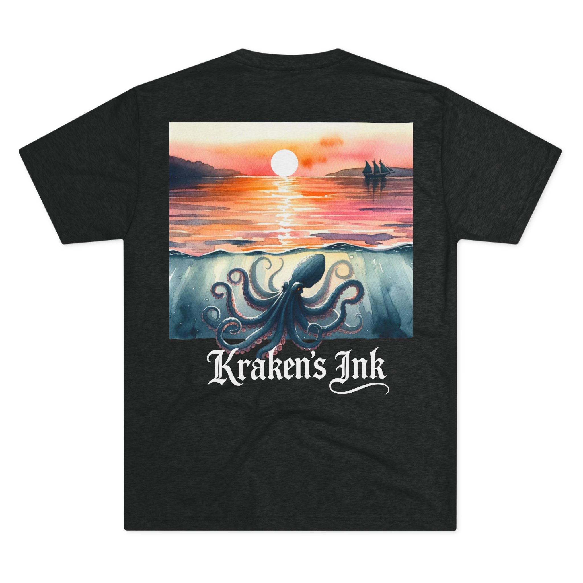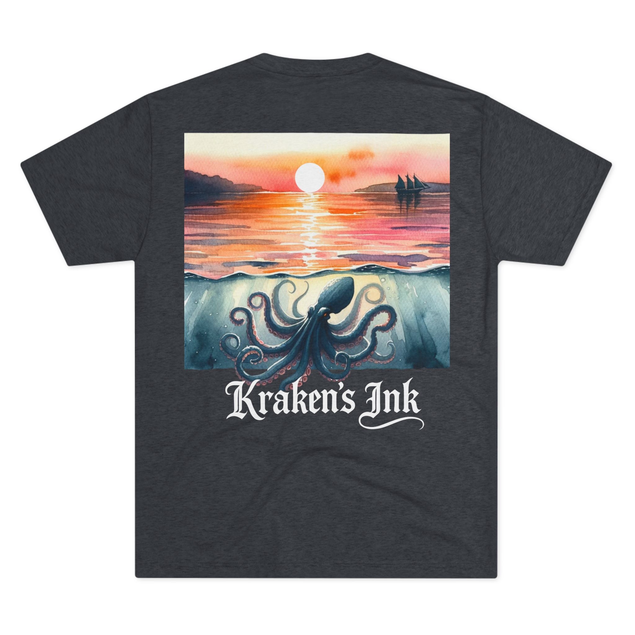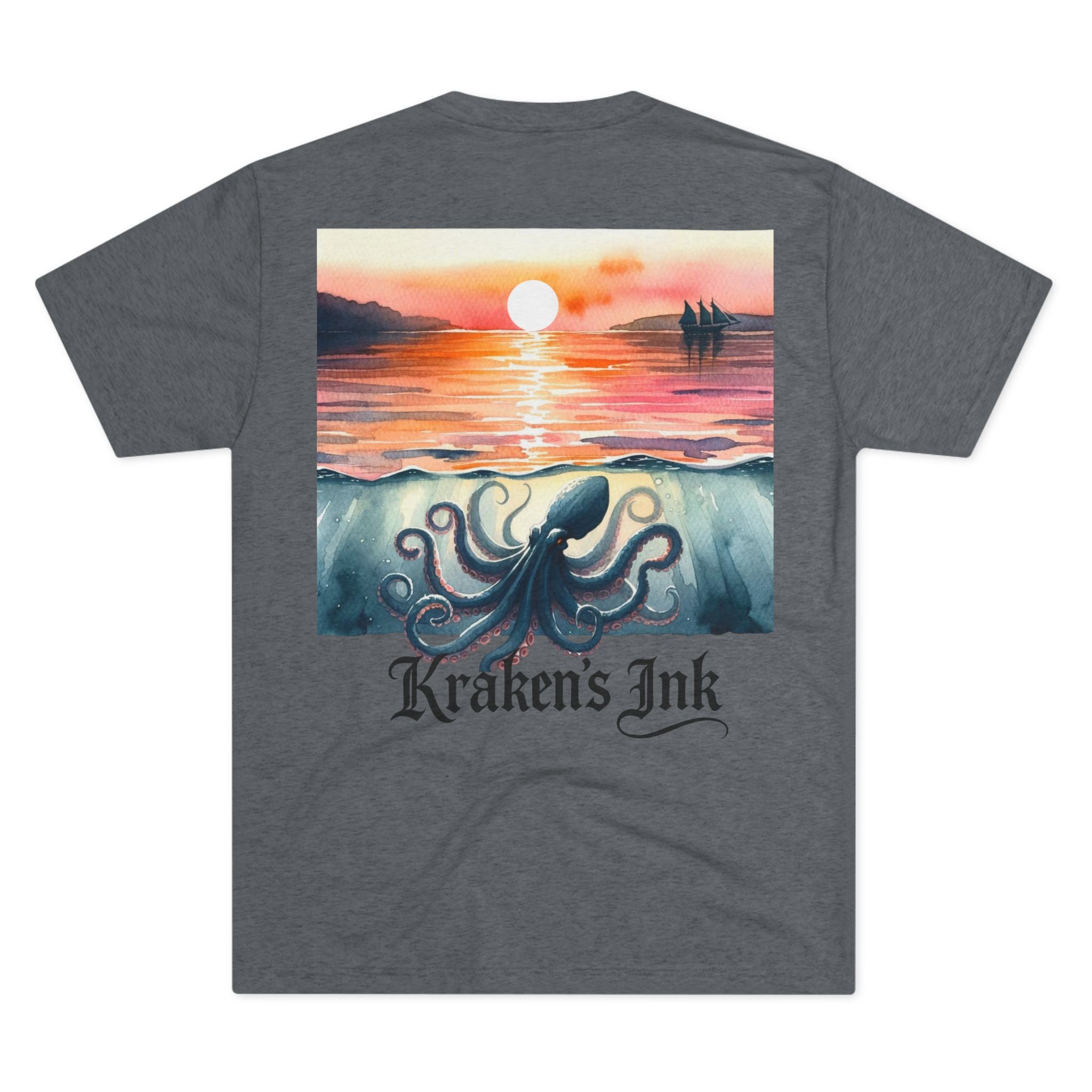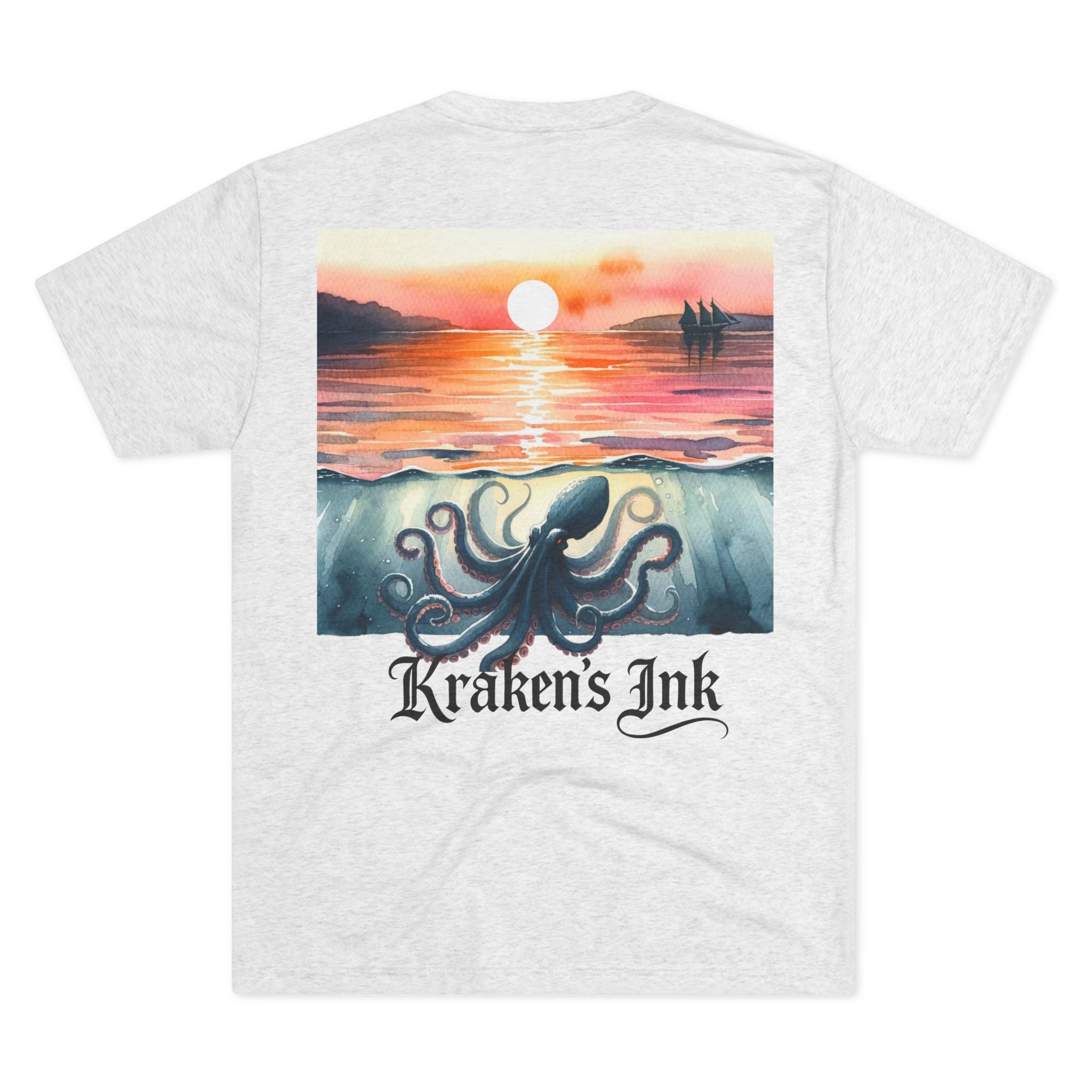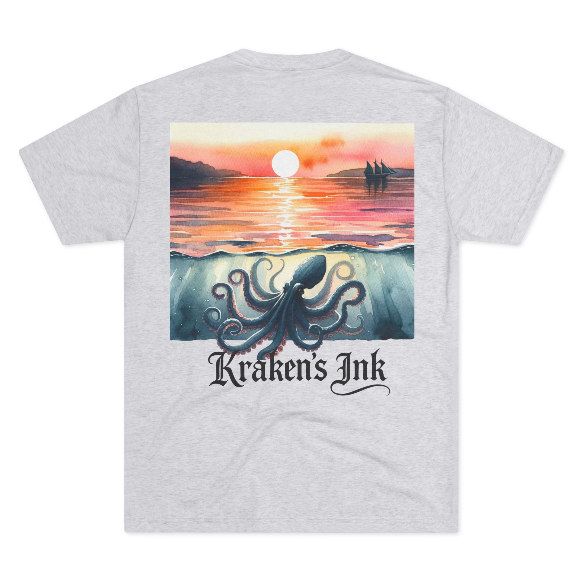 Soft, drapey, and artful — this tri-blend crew brings a quiet coastal mood to your everyday wardrobe. The front wears a small, vintage-inspired Kraken emblem over the heart; the back unfolds into a painterly sunset where an ink-dark kraken stirs beneath calm water as the sun slips away. Lightweight and breathable, the tee moves easily from long walks along foggy piers to late-night sketch sessions. It’s for those who love nautical lore, hand-inked illustration, and garments that feel lived-in from day one.