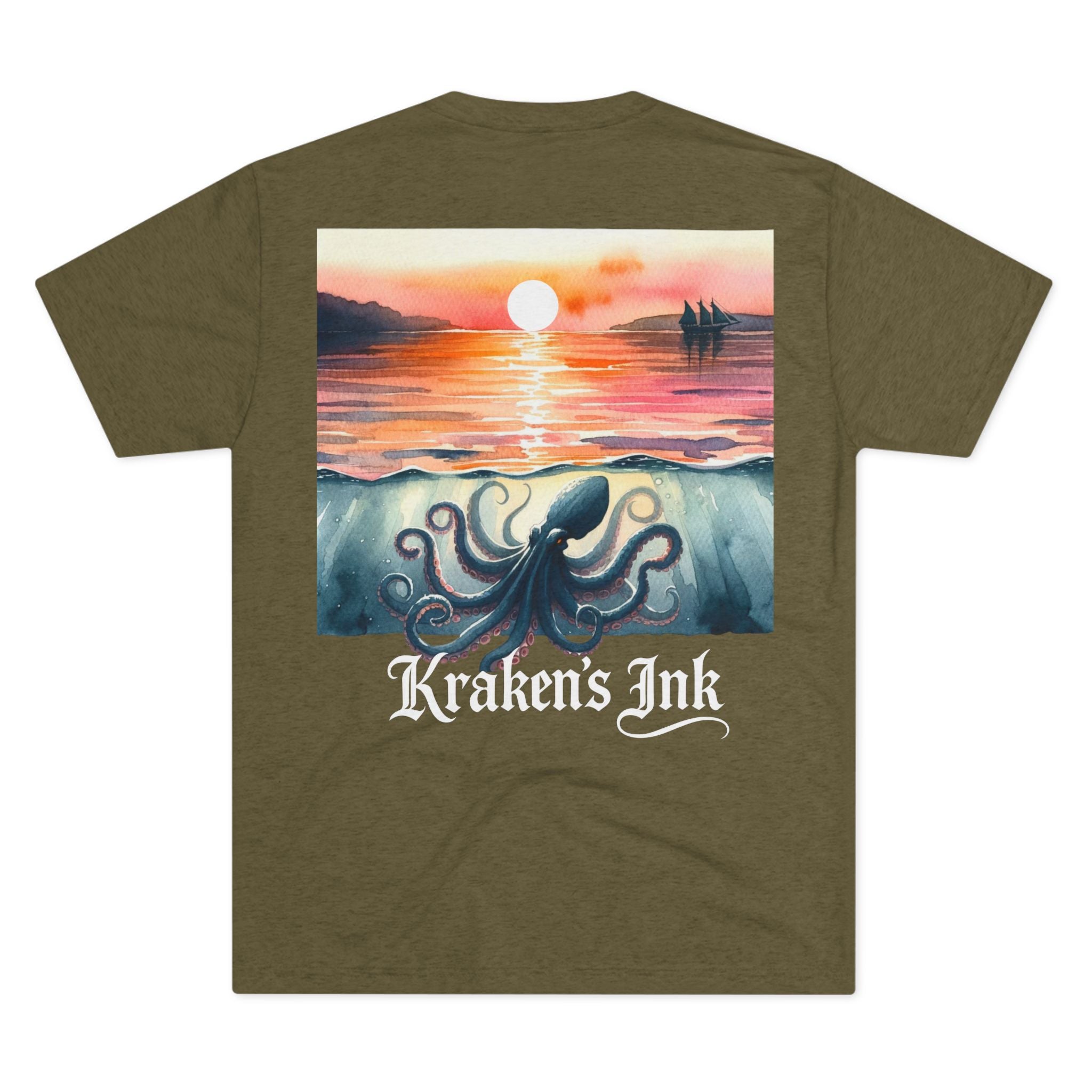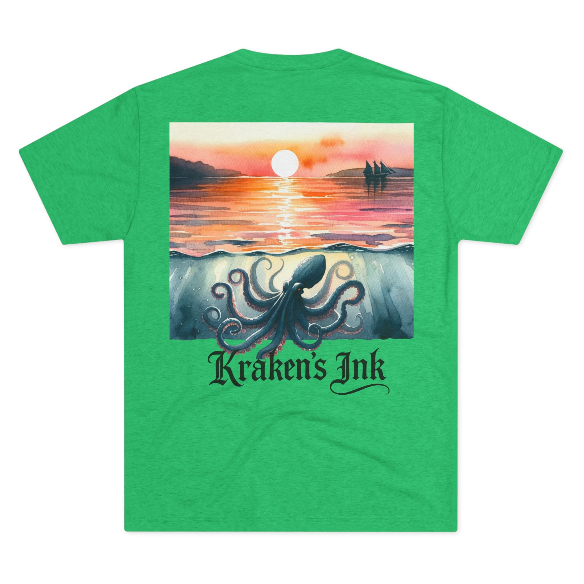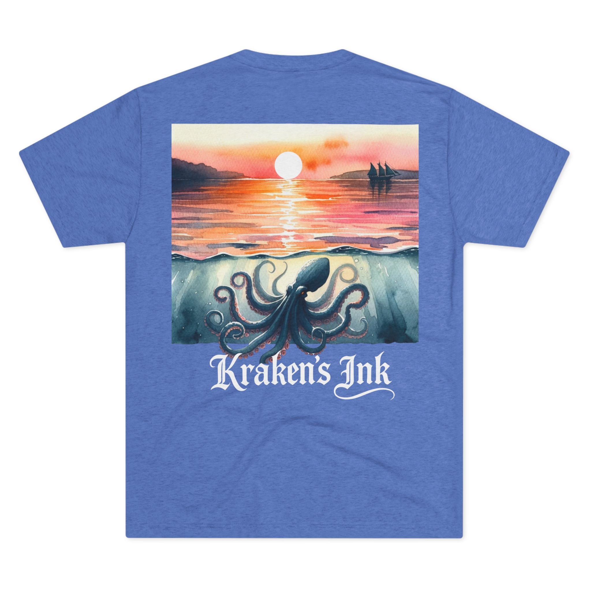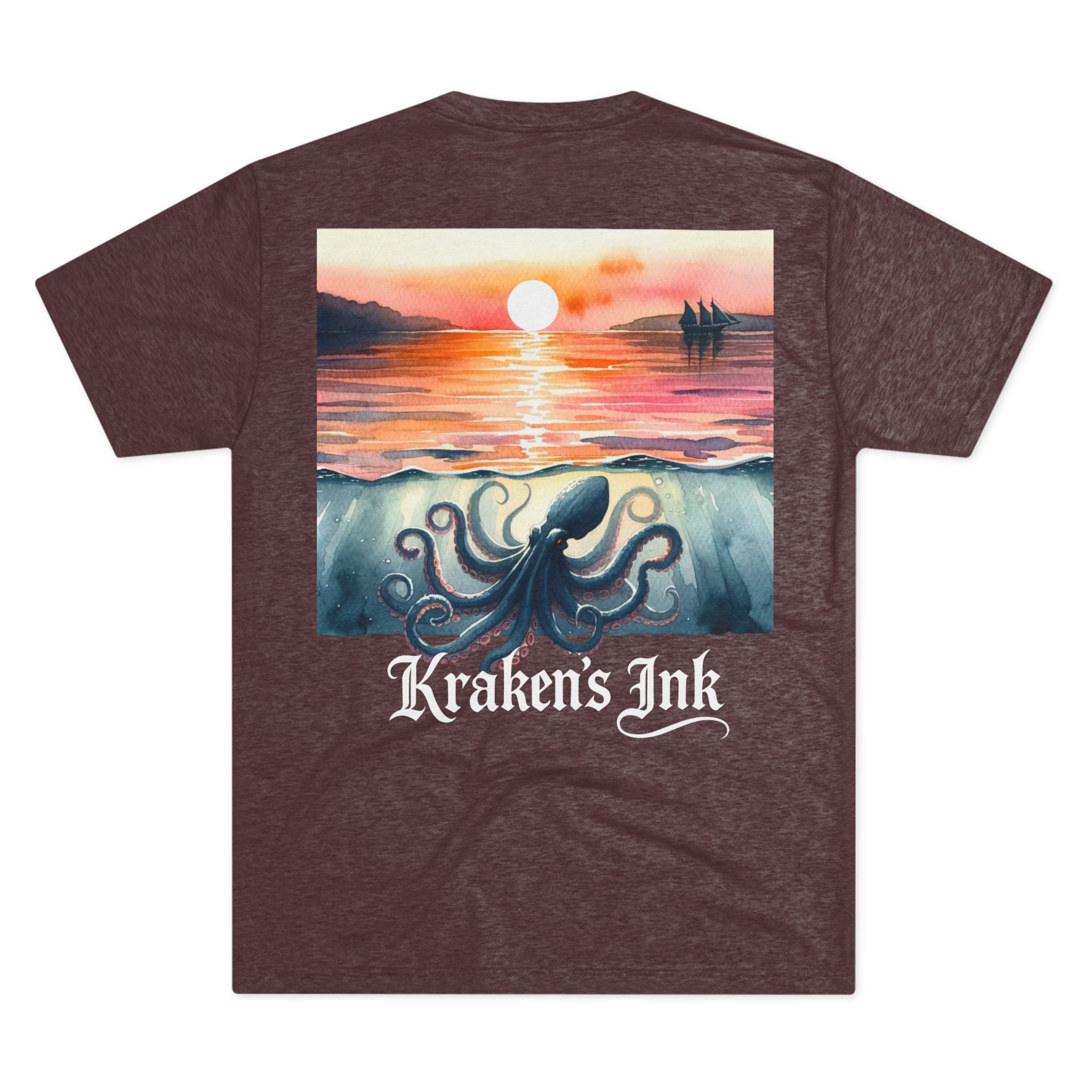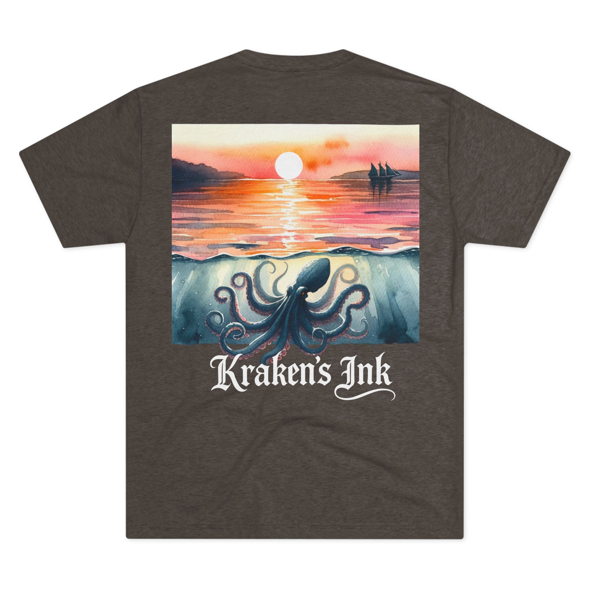 Soft, drapey, and artful — this tri-blend crew brings a quiet coastal mood to your everyday wardrobe. The front wears a small, vintage-inspired Kraken emblem over the heart; the back unfolds into a painterly sunset where an ink-dark kraken stirs beneath calm water as the sun slips away. Lightweight and breathable, the tee moves easily from long walks along foggy piers to late-night sketch sessions. It’s for those who love nautical lore, hand-inked illustration, and garments that feel lived-in from day one.